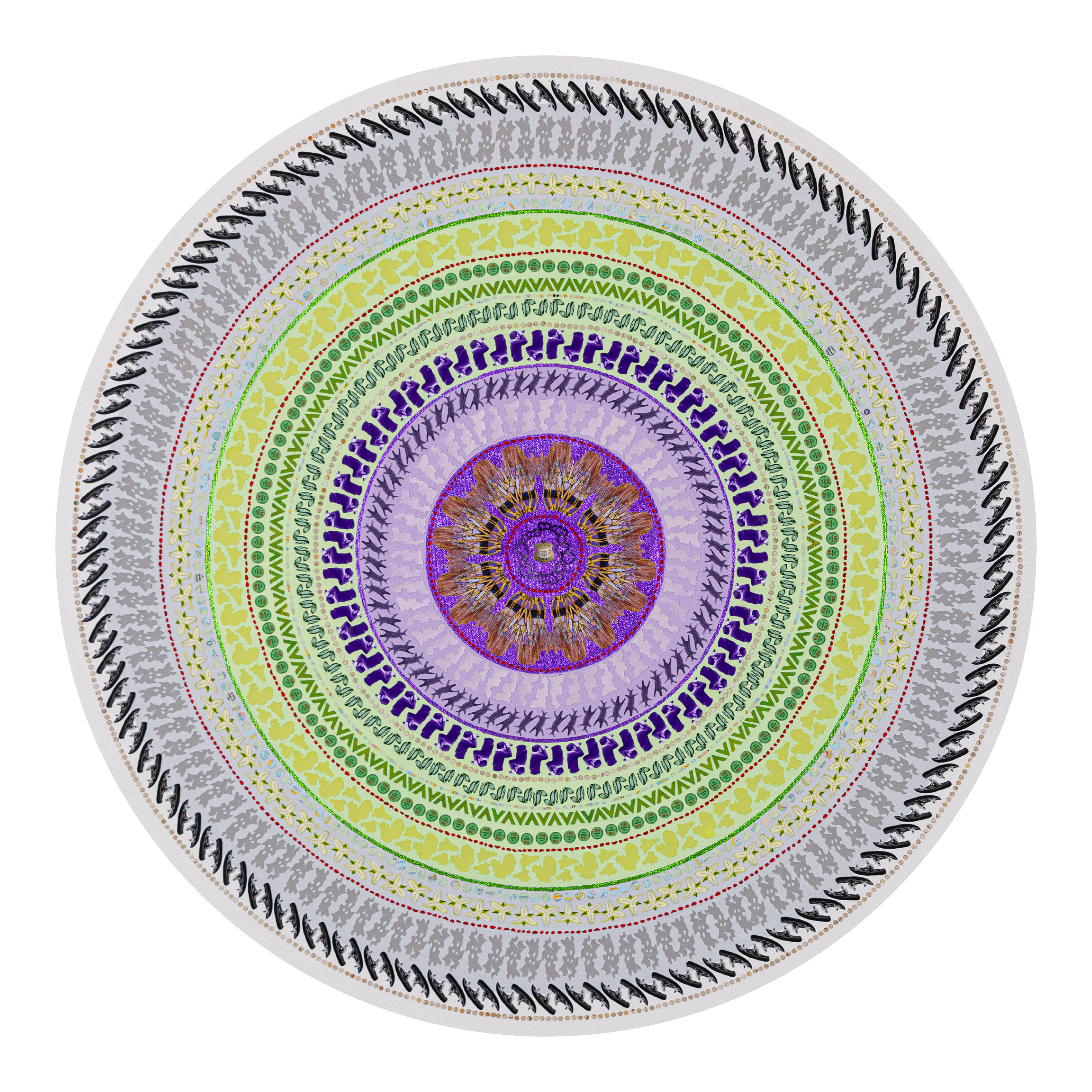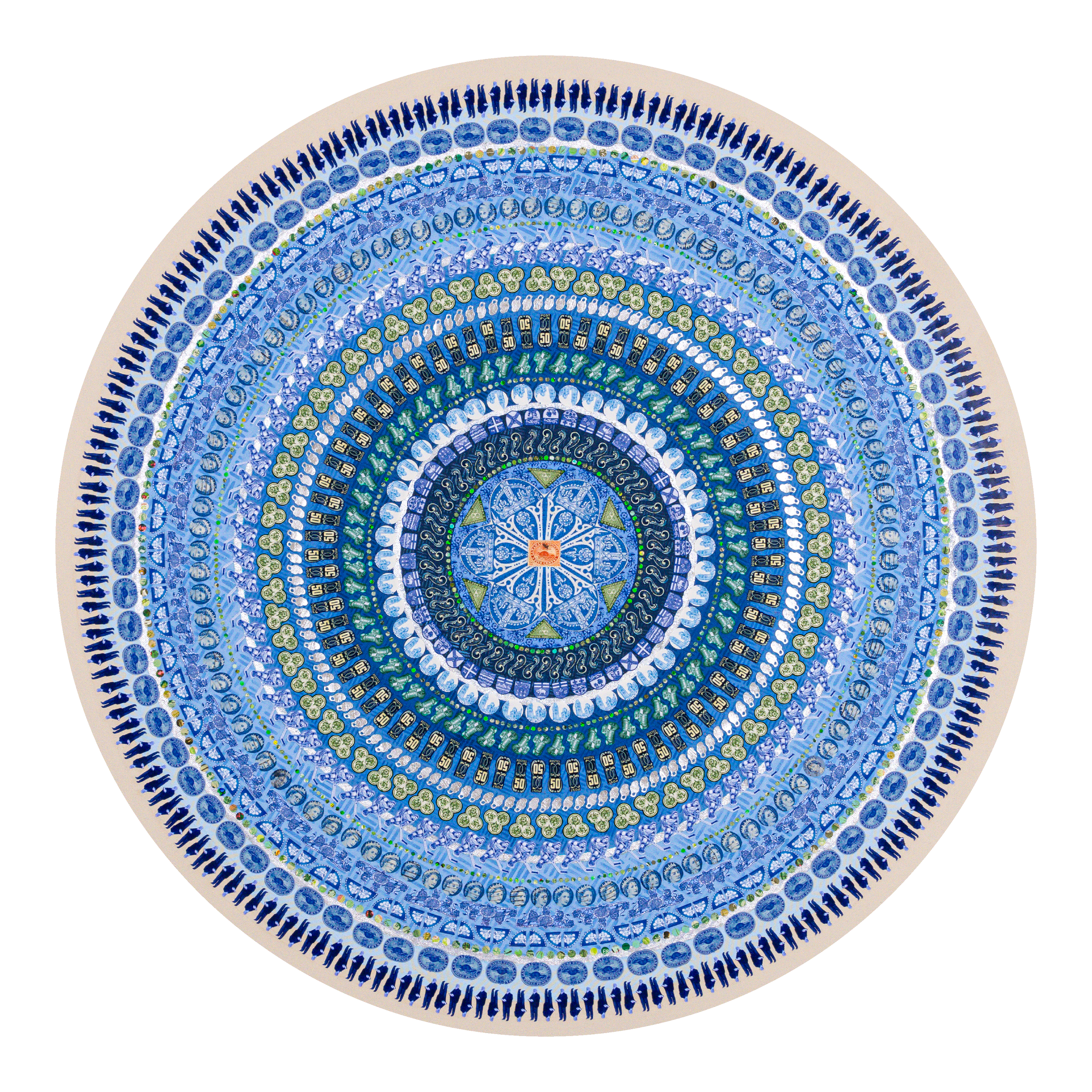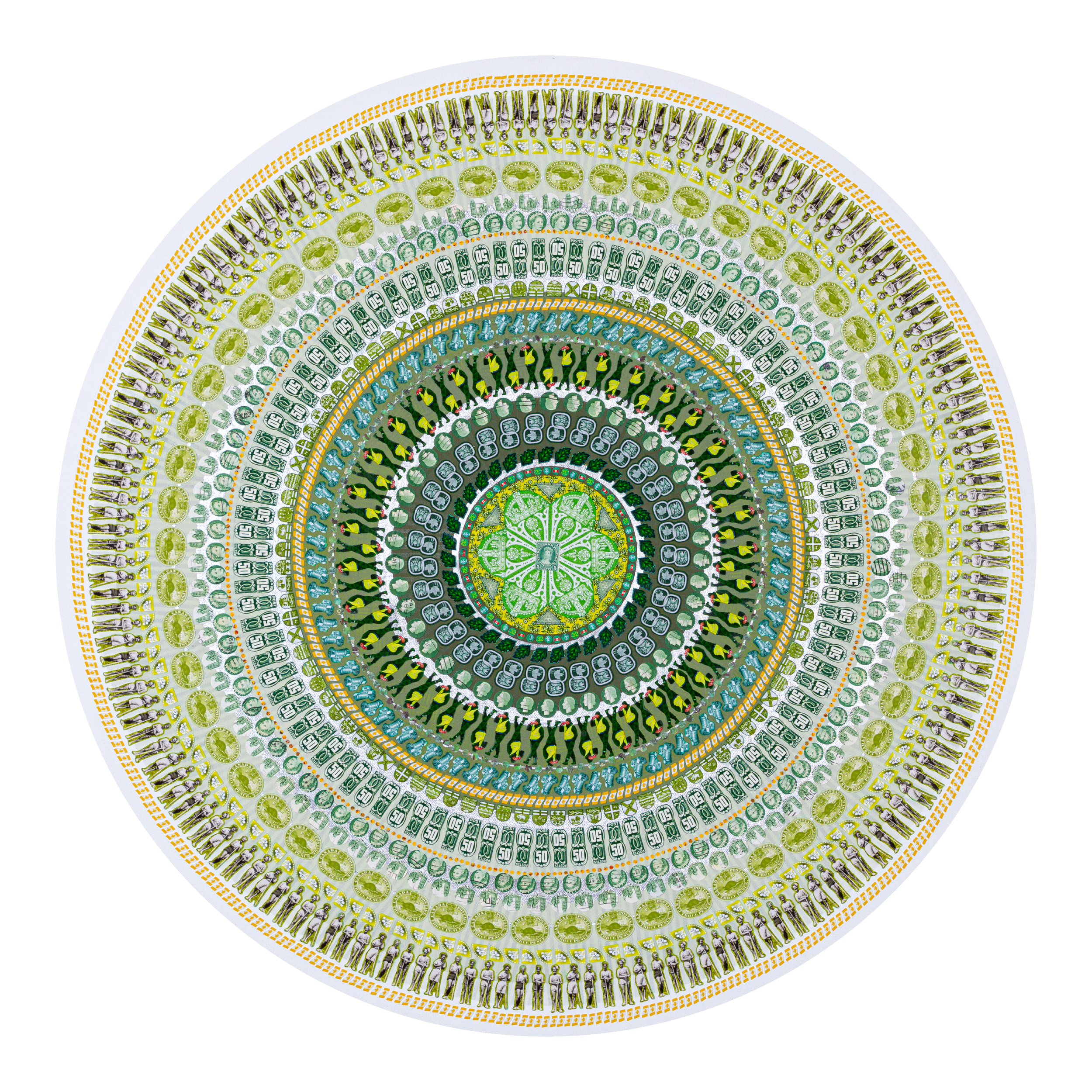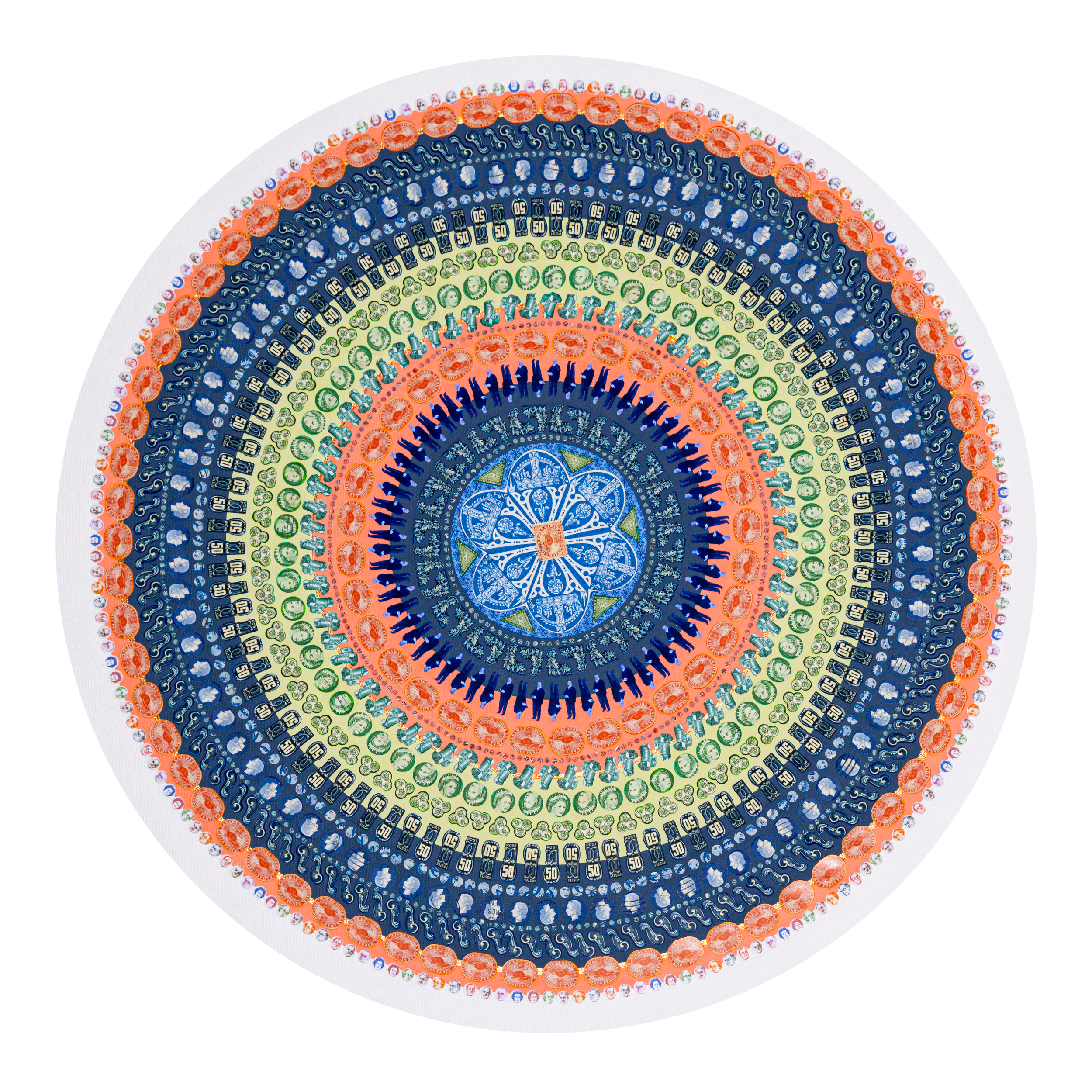 Lesley Luce creates intricate concentric compositions from thousands of hand-placed paper fragments. Drawn from archives, history, literature, and personal collections, these fragments form layered visual narratives that reward closer inspection.