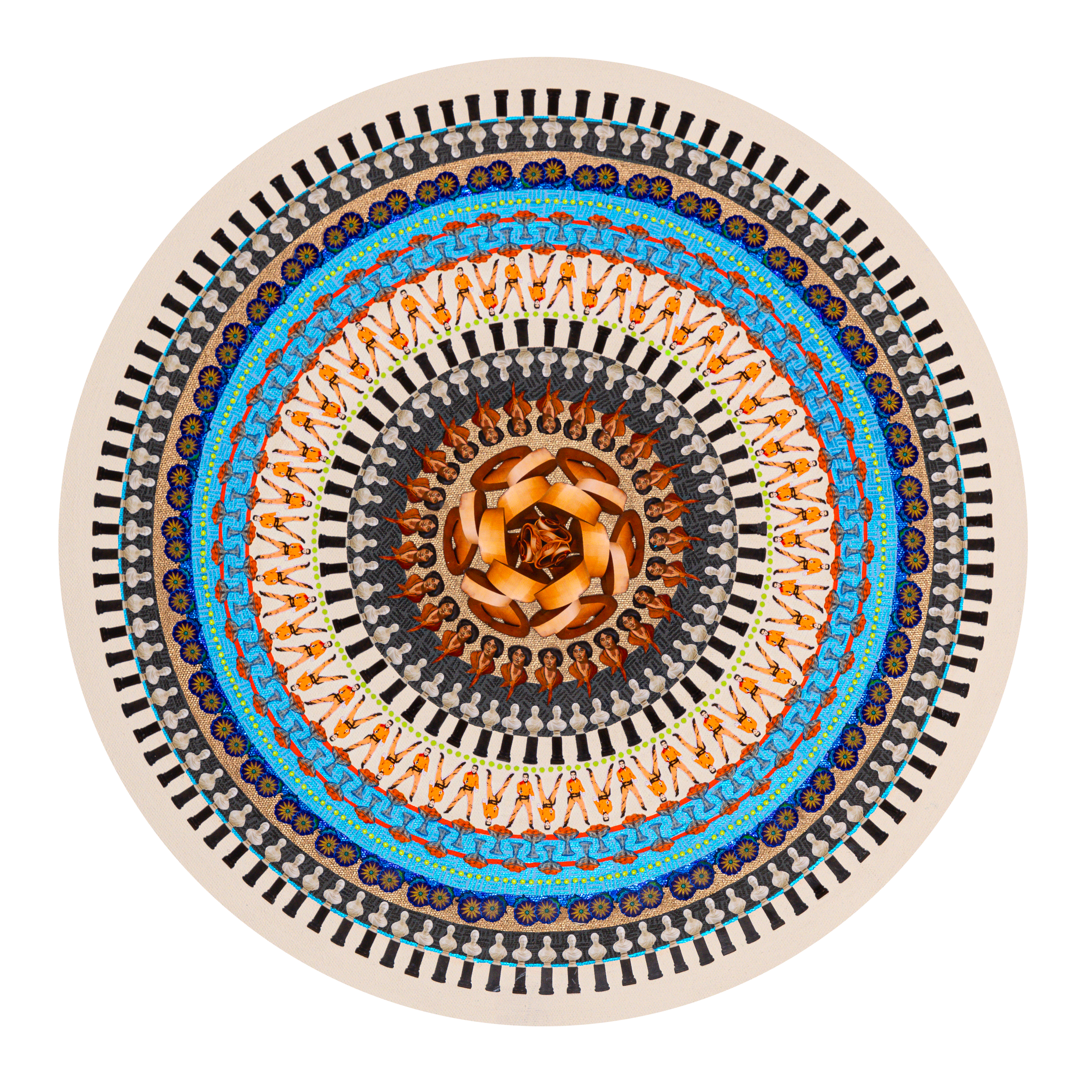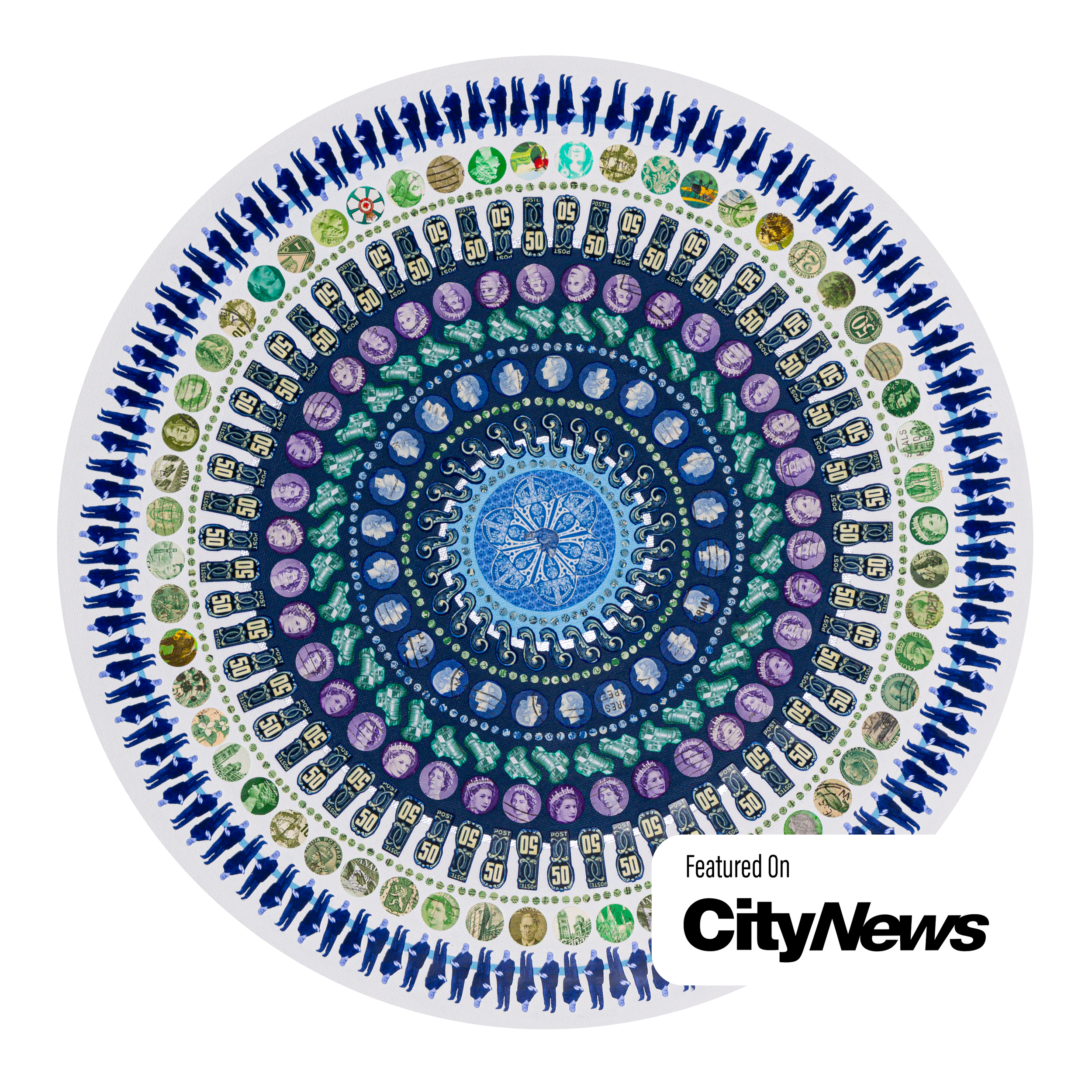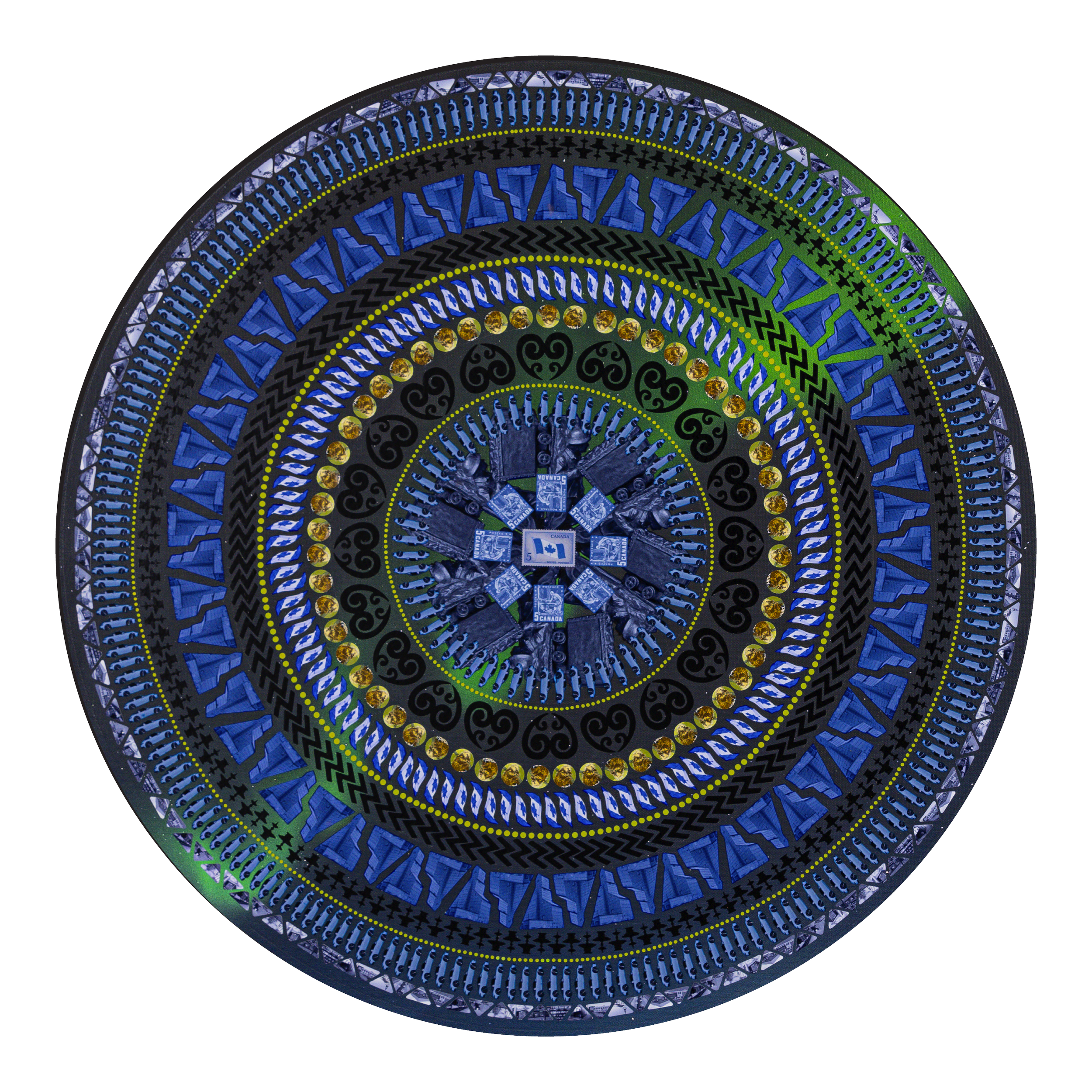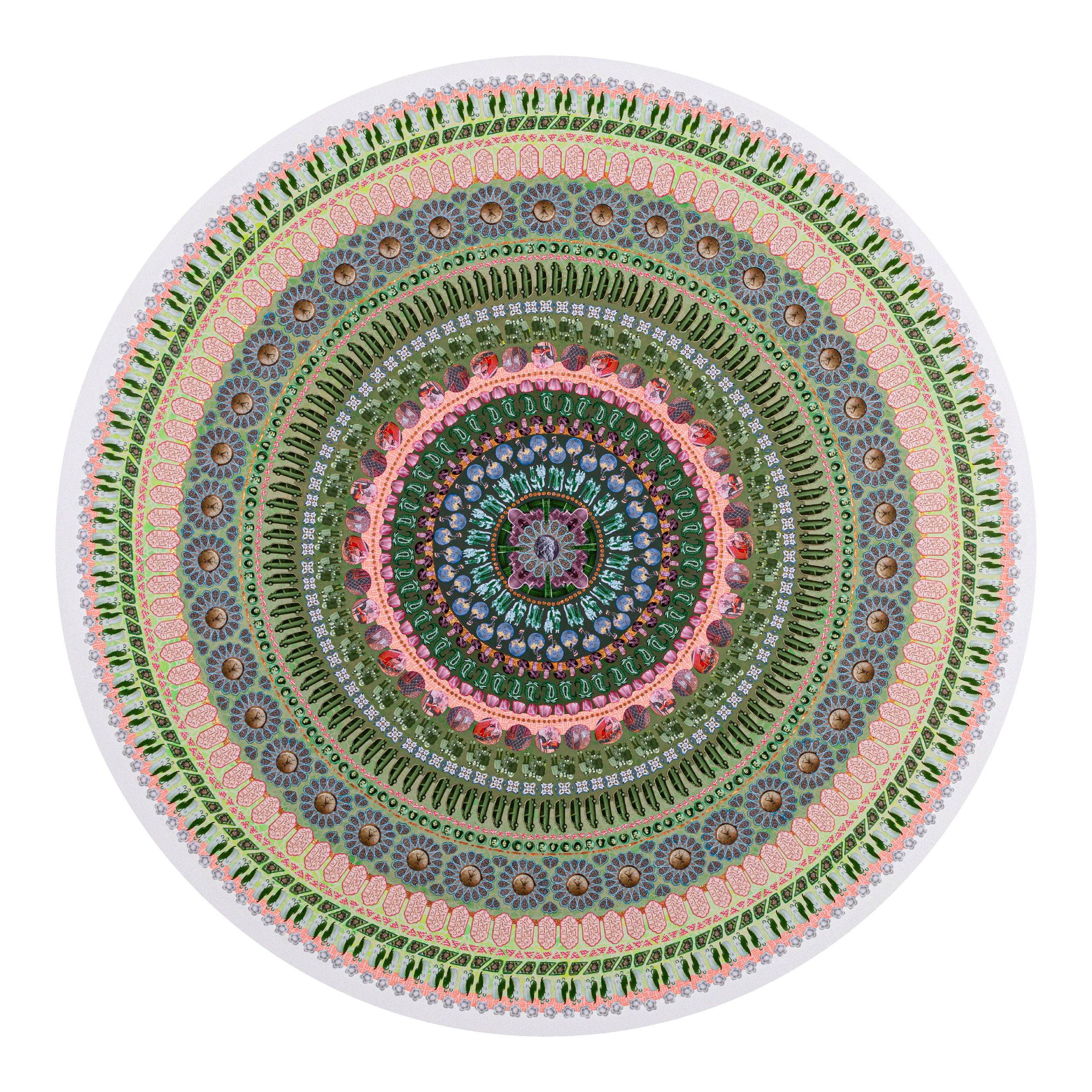 Lesley Luce creates intricate concentric compositions from thousands of hand-placed paper fragments. Drawn from archives, history, literature, and personal collections, these fragments form layered visual narratives that reward closer inspection.