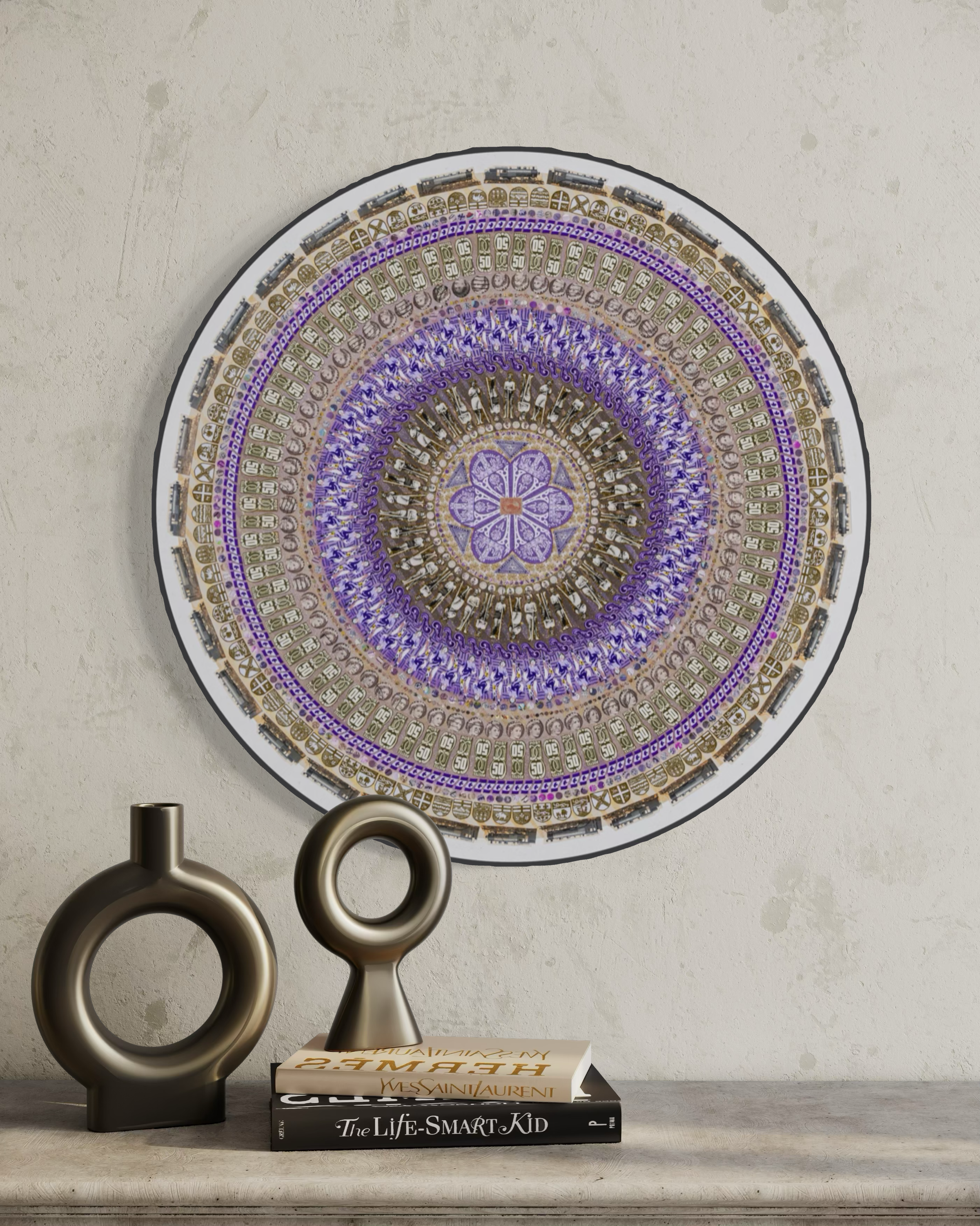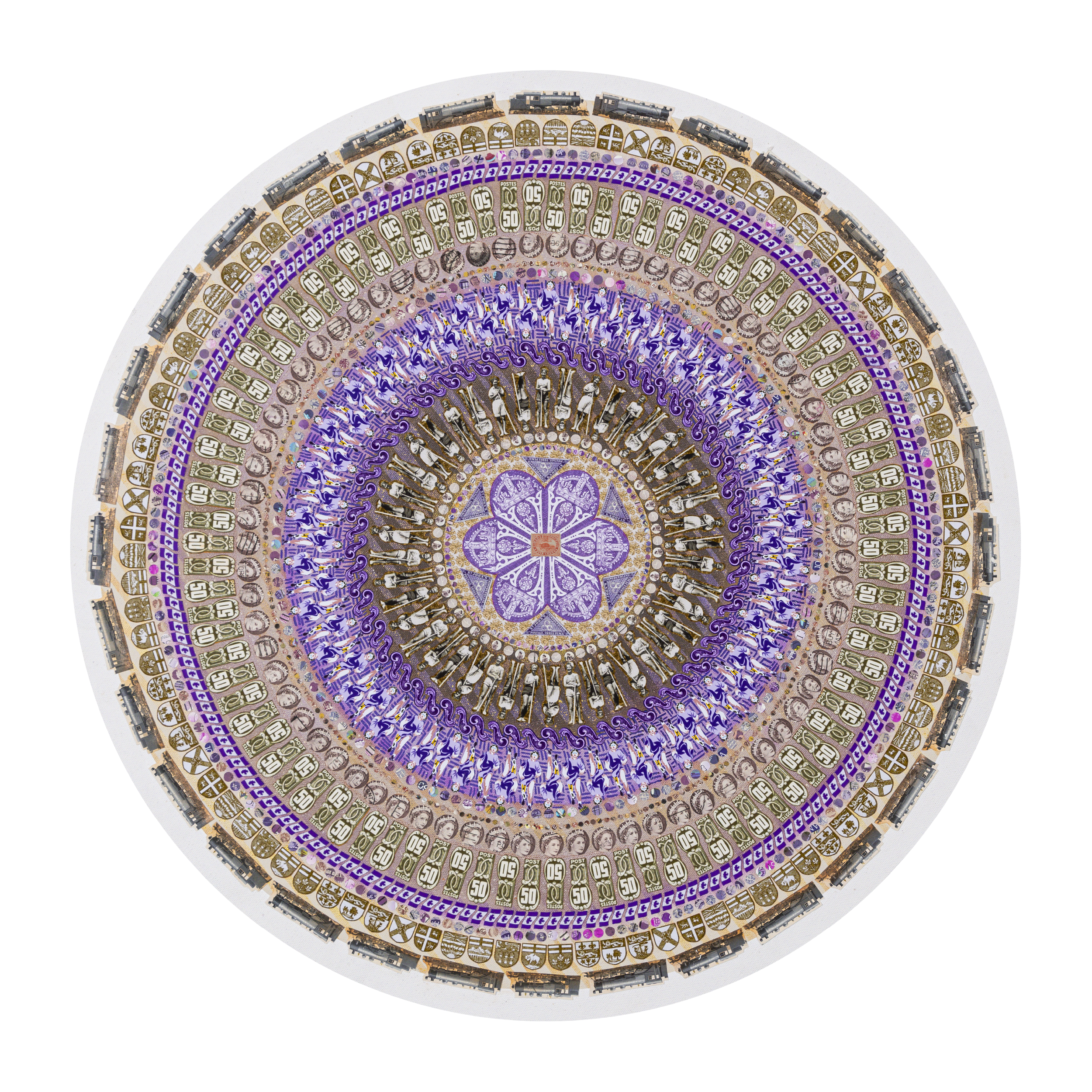 A Royal Dispatch, Composition 0224 by Lesley Luce explores Canada’s evolving identity through the imagery and symbolism of its postage stamps, with the title referencing both the royal purple palette, long associated with power and status, and the act of sending and receiving mail. The work assembles a visual archive of how Canada has represented itself across generations. From a distance, the composition appears as a bold geometric pattern. Up close, its intricate details reveal layers of symbols and references, from early pre-Confederation stamps to images of national identity, history, and exchange, bringing together the stories that have shaped how Canada defines itself.
