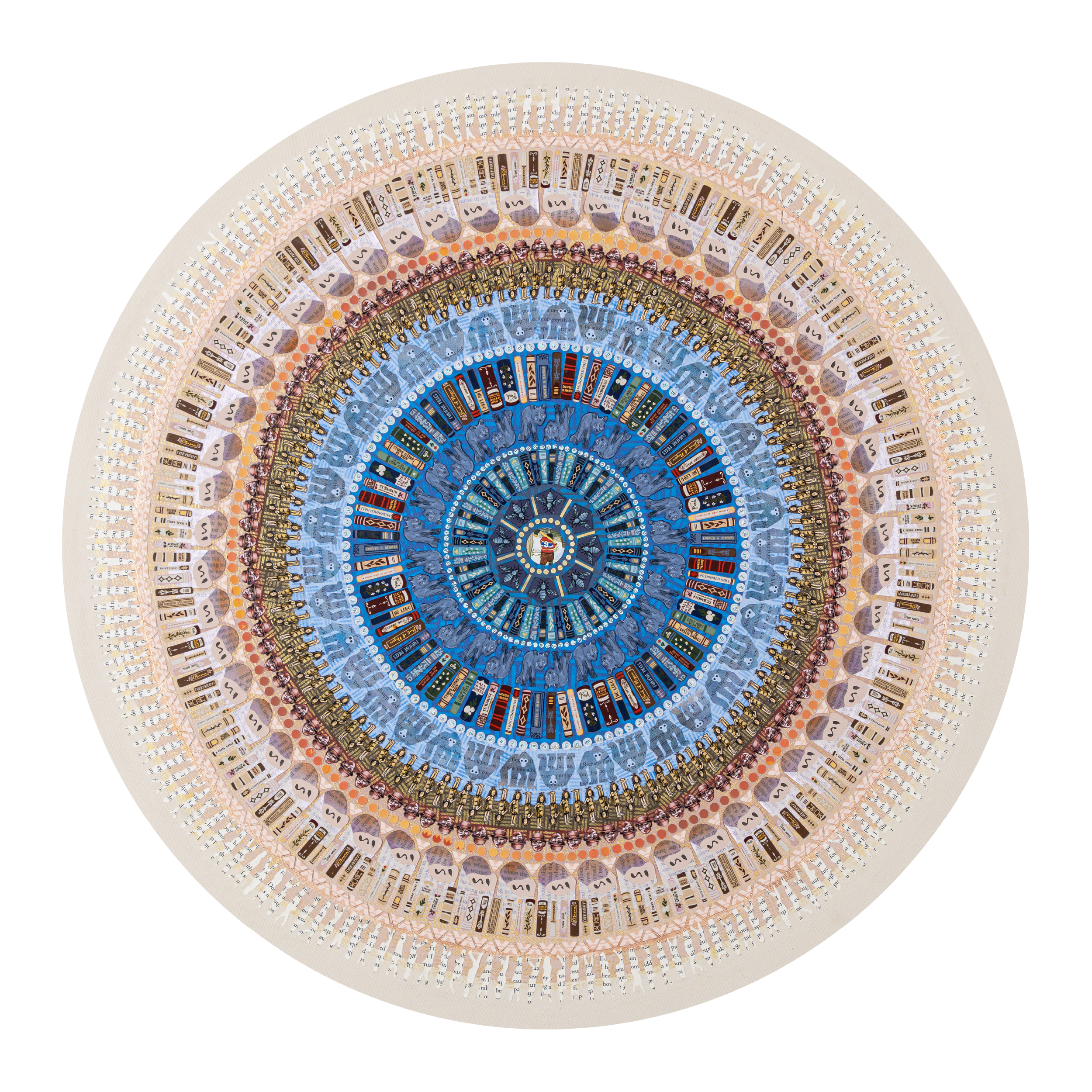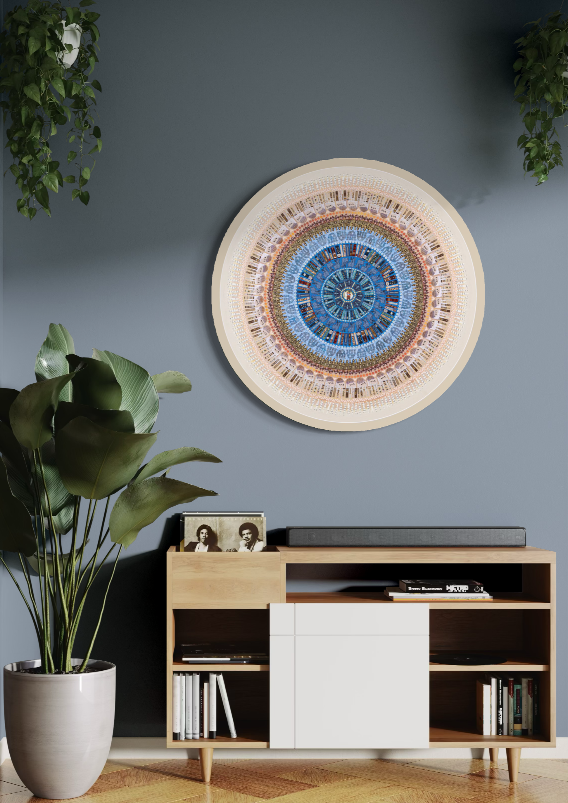 Somewhere in the Stacks, Composition 0902 by Lesley Luce explores Canadian literature through imagery, symbolism, and memory. Arranged in repeating concentric rings, the work incorporates fragments from book covers, pages, and graphic elements connected to widely recognized works of Canadian writing. The title is inspired by the Toronto Reference Library, whose iconic architecture and vast stacks invite curiosity and discovery.
