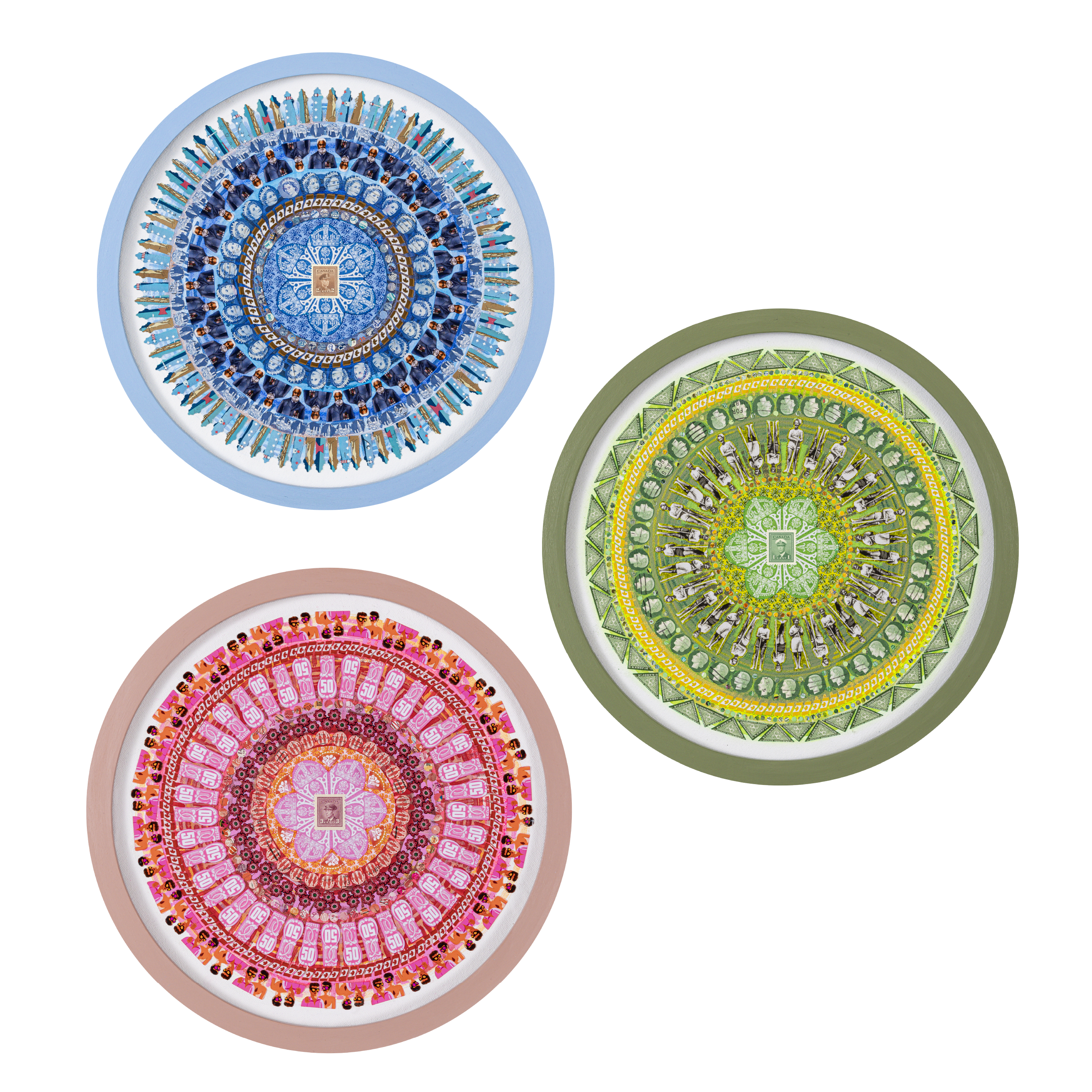 Where the Flags Fly, Triptych 0412 by Lesley Luce explores Canada’s evolving identity through the imagery and symbolism of its postage stamps. Presented as a triptych, the work assembles a visual archive of how Canada has represented itself across generations. The title is drawn from a fragment of the Hanlan’s Point Beach stamp, an important gathering place for Canada’s 2SLGBTQI+ community. From a distance, the composition appears as a bold geometric pattern. Up close, its intricate details reveal layers of symbols and references, from early pre-Confederation stamps to images of visibility, belonging, and national identity, forming a portrait of the stories that shape who is seen, and where.