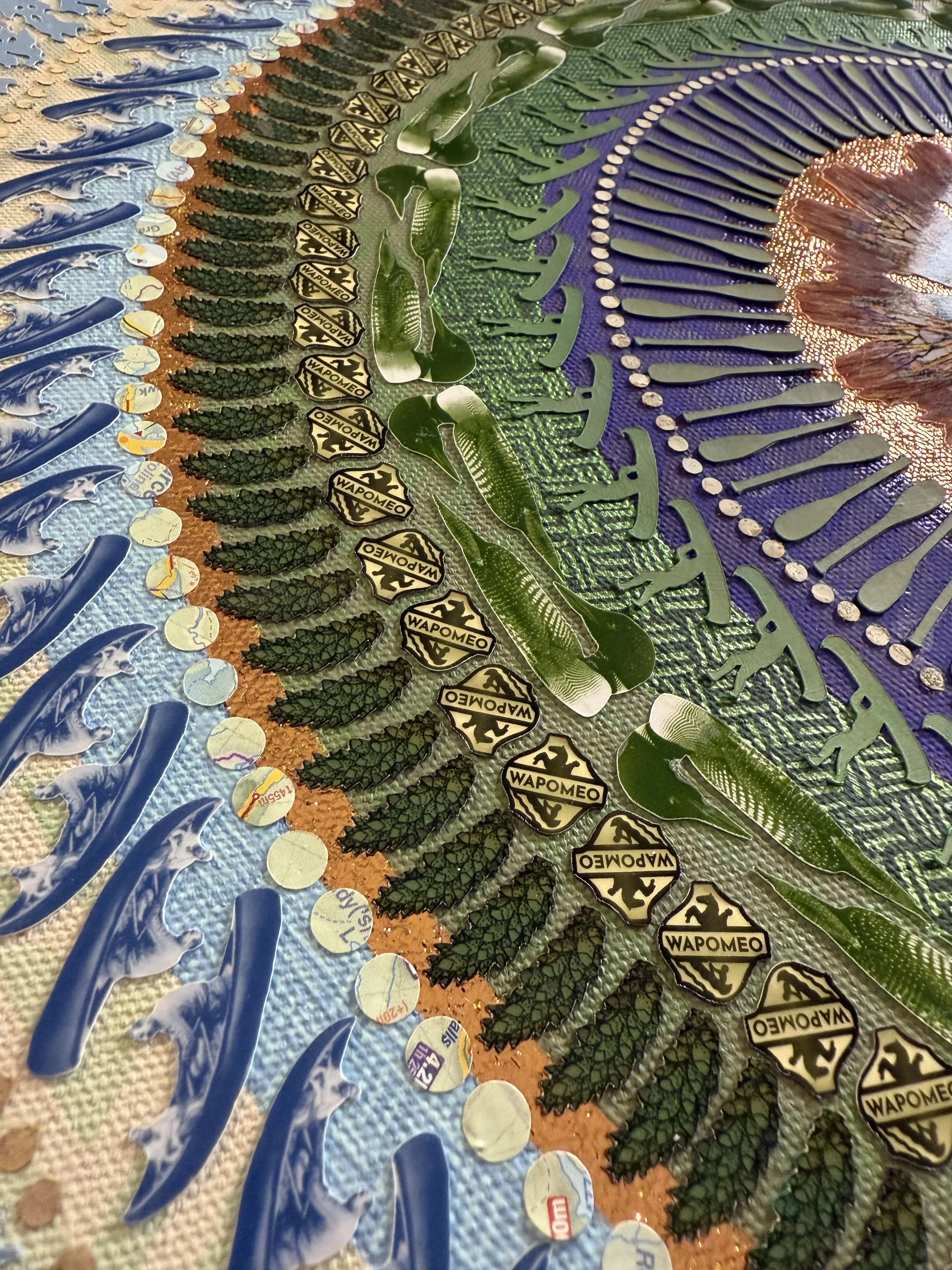 From a distance, the abstract structure draws the viewer in, while closer inspection reveals intricate symbols of memory, resilience, and transformation. This work bridges personal ritual and cultural history, inviting viewers to reflect on their own connections to Canoe Lake, renewal, and quiet strength.