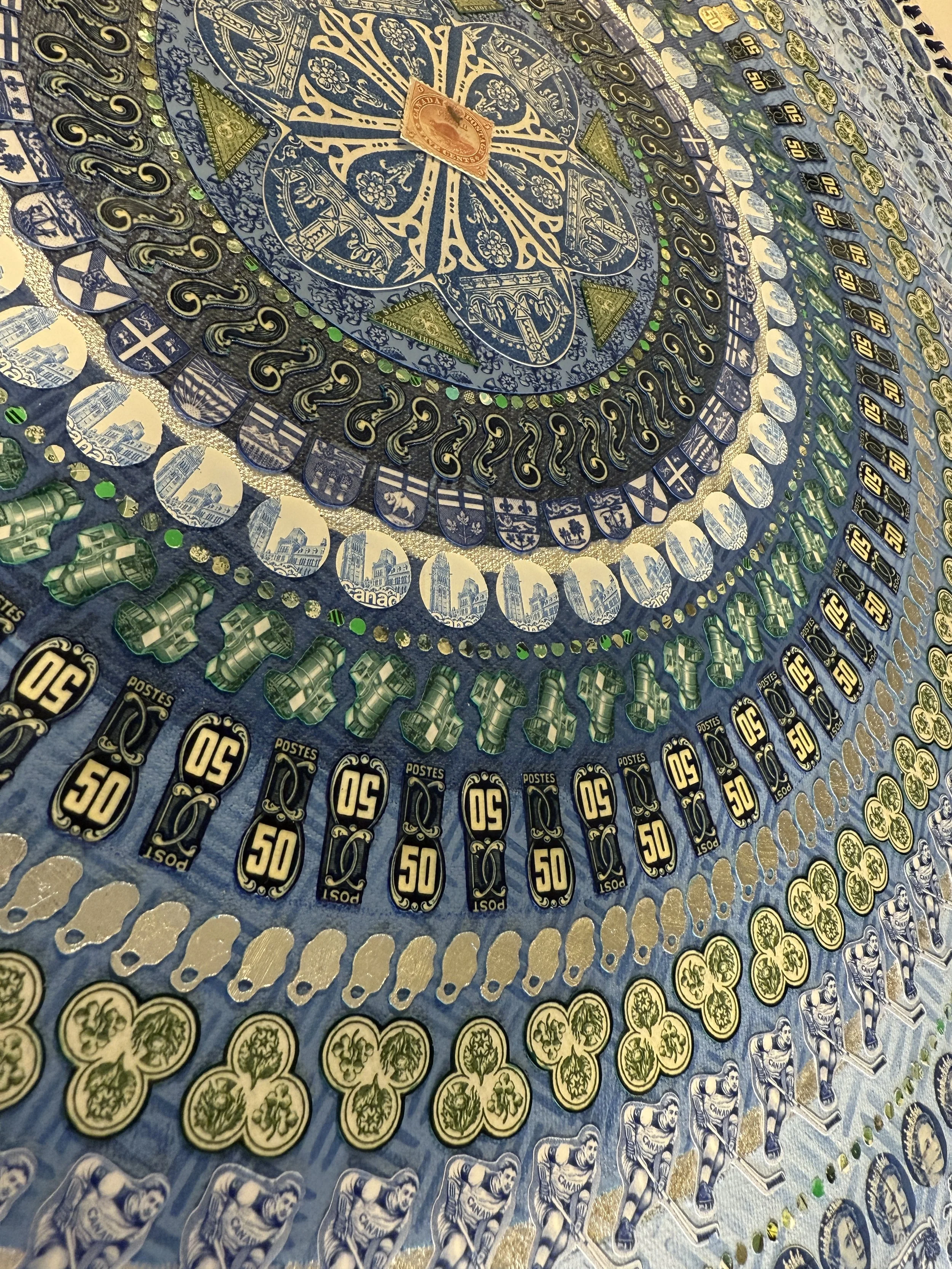 Wood panel, canvas, acrylic paint, ChromaLife100+ ink, paper, and postage stamps from the artist’s personal collections